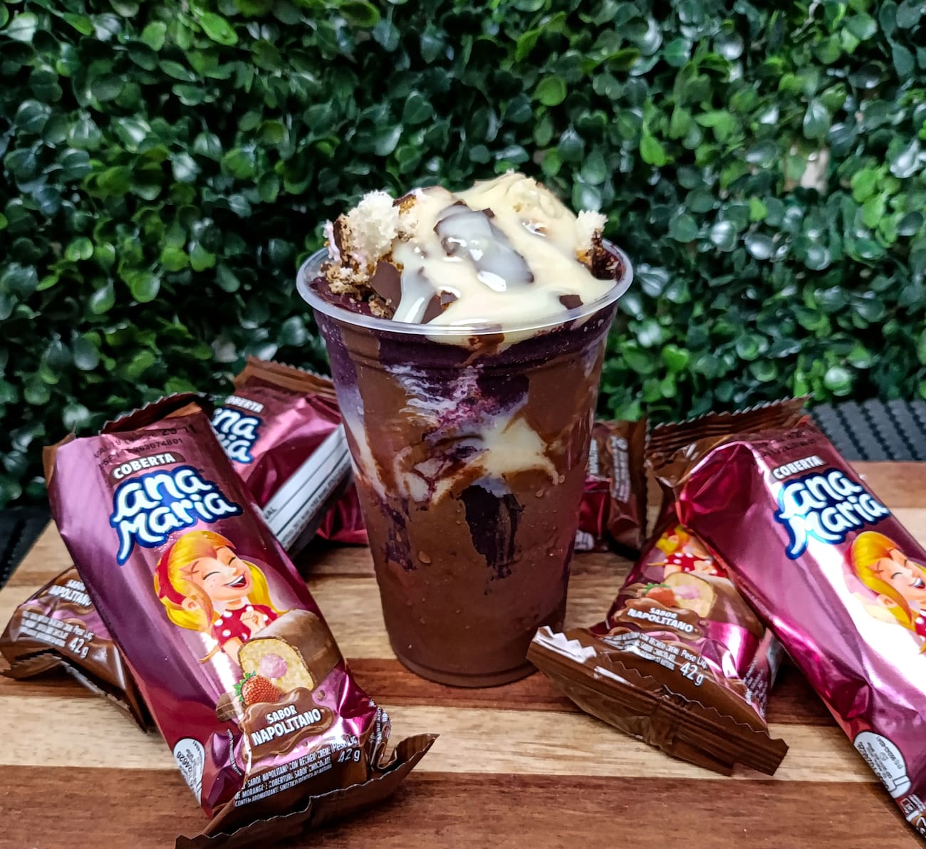 Açaí, Bolinho Ana Maria Napolitano, Chocolate ao Leite, Leite Condensado e Banana.